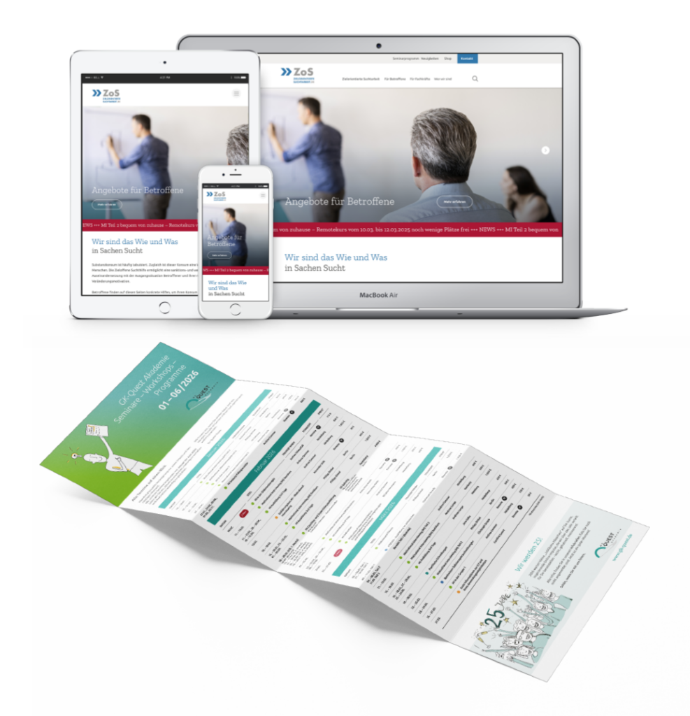 Für ZoS – Zielorientierte Suchtarbeit entstand daraus eine nutzerzentrierte Website für eine soziale Organisation: klar strukturiert, ruhig gestaltet und mit eindeutiger Nutzerführung für Betroffene und Fachkräfte, damit Menschen schneller finden, was sie gerade wirklich brauchen.